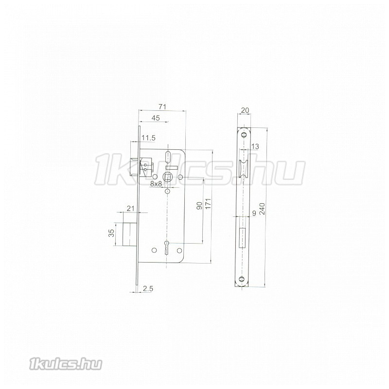 Szögletes előlappal rendelkező, dupla reteszelésű, Euro profilú cilinderes bevésőzár.