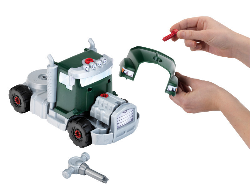 1:24 léptékű Bosch szerelő kamion 86 darabos szerelőkészlettel. Levehető szerszámosládával, utánfutóval, daruval, villás raklapemelő targoncával és csavarozó eszközzel.