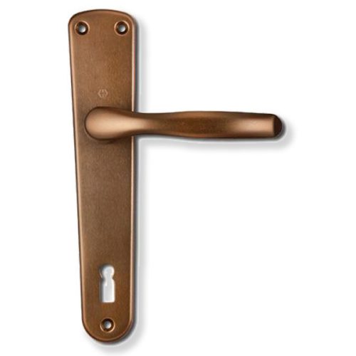 Hoppe Milano kulcsos kilincs garnitúra (F4) bronz színben. Alkalmazható egyaránt balos és jobbos ajtókon is. Kiemelt méretként kezelendő a 90 mm, mely a kilincstengely és a kulcslyuk közötti távolságot jelöli.