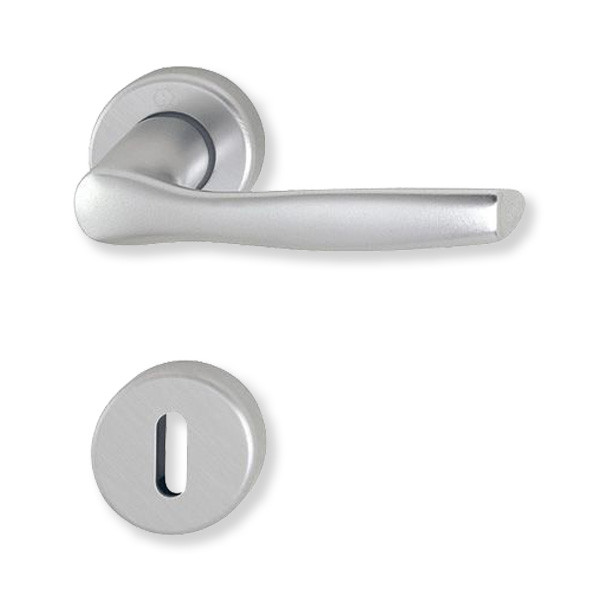 Hoppe Milano rozettás belsőajtó kilincsgarnitúra (F1) aluminium színben, kulcsos. A rozetta alsó része műanyag, rejtett csavarozás facsavarokkal. Alkalmazható egyaránt balos és jobbos ajtókon is.