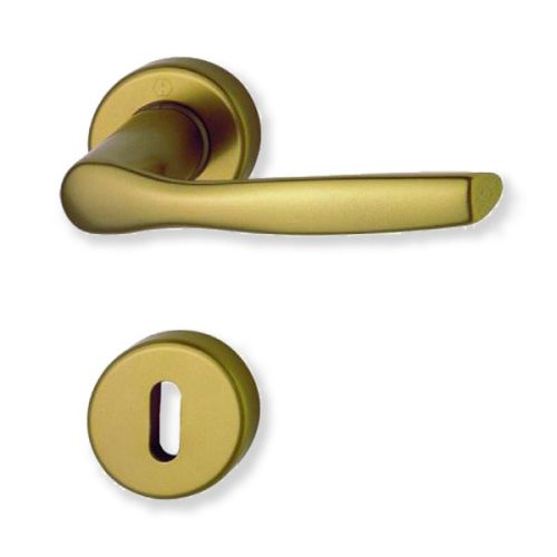 Hoppe Milano rozettás belsőajtó kilincsgarnitúra (F4) bronz színben, kulcsos. A rozetta alsó része műanyag, rejtett csavarozás facsavarokkal. Alkalmazható egyaránt balos és jobbos ajtókon is.
