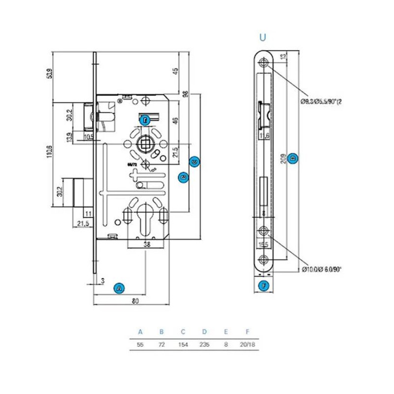 B méret - Kilincs és kulcsközép távolság: 72 mm