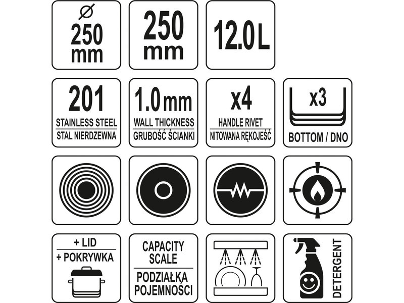 YATO YG-00012 GASTRO Fazék fedővel 12 liter 250 x 250 mm inox
