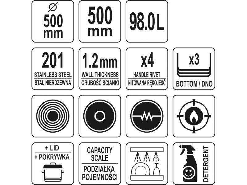 YATO YG-00020 GASTRO Fazék fedővel 98 liter 500 x 500 mm inox