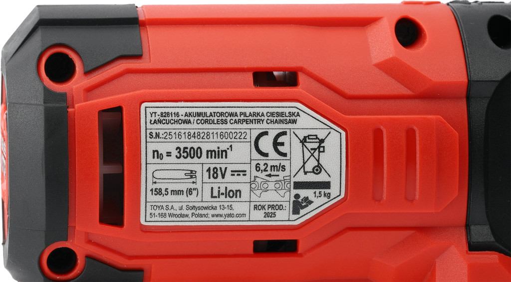 YATO YT-828116 Akkumuátoros ács láncfűrész 6 col láncvezetővel, szénkefe nélküli motorral (akku + töltő nélkül)