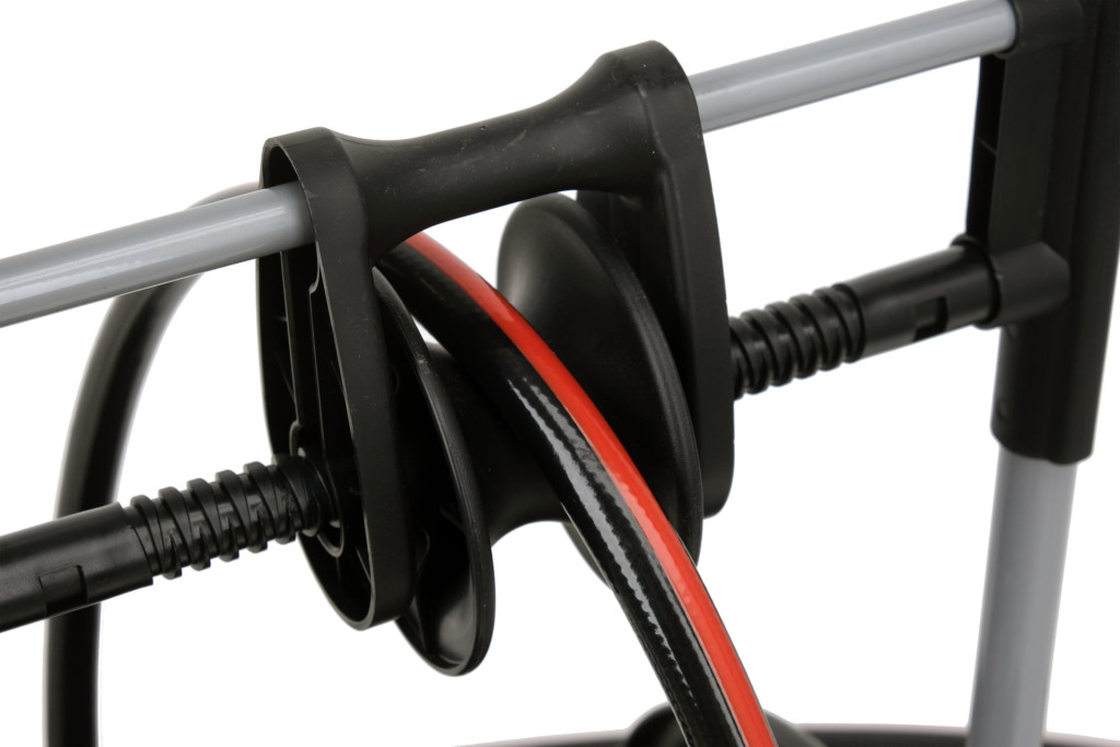 2 m hosszúságó különálló bekötőcső 1/2 colos és 3/4 csolos belső menetes lány csapcsatlakozóval, egyenes szórófejjel szerelve, lábpedál a tömlő visszacsévélésére