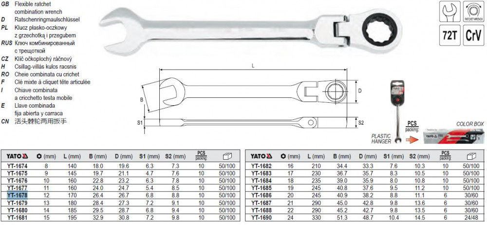 YATO YT-1678 Racsnis csuklós csillag-villáskulcs 12 mm / 170 mm 72T CrV