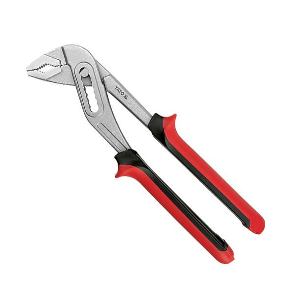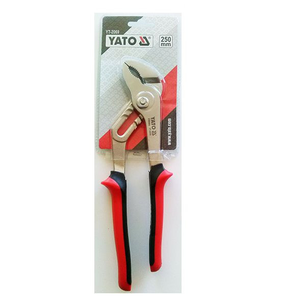 YATO vízpumpafogó. Pofájának szélessége egyfajta sines rendszerben állítható, kialakítása pedig lehetővé teszi a lapos, és a hengeres dolgok fogását egyaránt. A fogó teljes hossza 250mm. Markolatai csúszásmentes gumiborítással lettek ellátva.