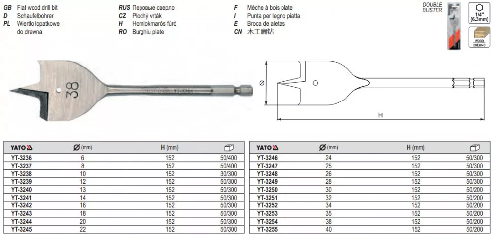 Homlokmarós fafúró a YATO-tól. Nagyobb furatátmérőknél szokás ezt a fajta fúrót használni. Használják egyaránt oszlopos és kézi fúrásra is. Befogása hatlapolt 6,3mm-es bitbefogás. A fúrószár teljes hossza 152mm. Az elején lévő kis vezetőcsúcs segít a fúrást központosítani, így a furás megkezdésekor sem táncol el a fúrószár a központtól.