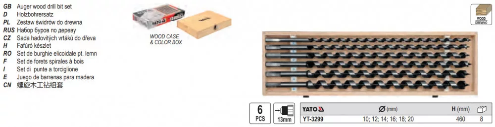 YATO YT-3299 Auger fafúró készlet 6 részes (10-12-14-16-18-20 mm) 460 mm Hex