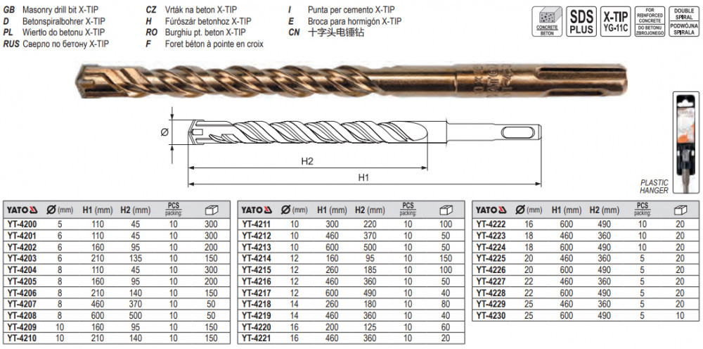 YATO keményfémlapkás, avagy vídiabetétes, négyélű SDS ütvefúrószár. Hegyébe a lapkák lézerhegesztéssel kerülnek rögzítésre, így a munkavégzést csupán a négy kis lapka végzi a fúrószár elejében, maga a fúrószár pedig csak hordozóként üzemel, és az ütéseket és a forgó mozgást közvetíti a gép és a lapkák között. Illetve még a csigás kialakításnak köszönhetően a törmelék kihordásában játszik szerepet.