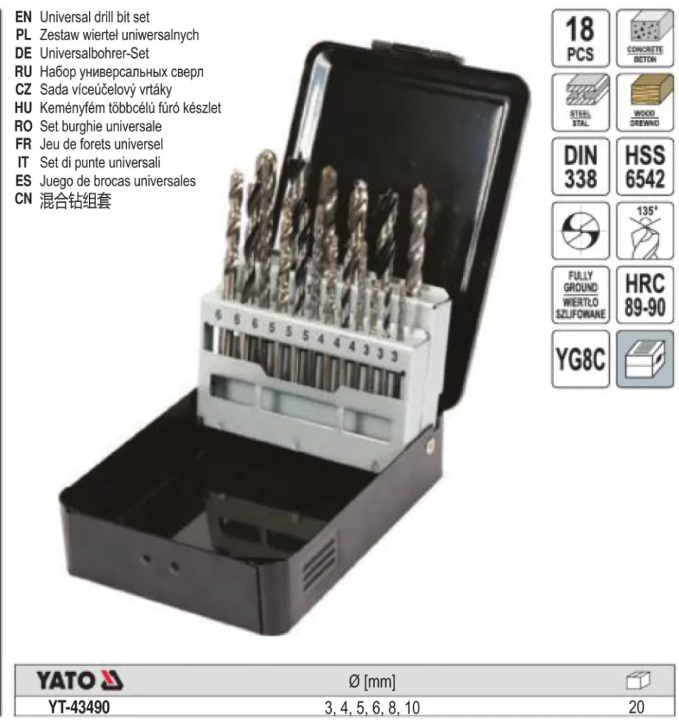 YATO YT-43490 Univerzális fúrókészlet 18 részes (kőzet, fém, fa)