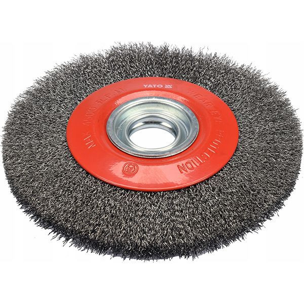 YATO tárcsás drótkefe, kettősköszörűre. Átmérője 150mm, furatátmérője 32mm, sörtéjének anyaga inox. Ebből kifolyólag alkalmas saválló, és rozsdamentes anyagok felületének tisztítására. Használata közben a sörtéiből elrepülő drótszálak miatt, minimum védőszemüveg használata kötelező, de munkavédelmi kesztyű is erősen javasolt.