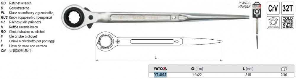 YATO YT-4937 Racsnis állványkulcs 19 x 22 mm / 315 mm CrV