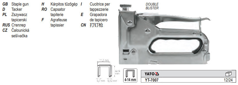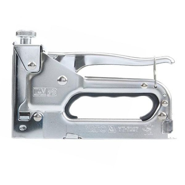YATO kézi tűzőgép, nikkelezett kivitel. Szögletes U kapcsokkal használható, 4-14mm mélységig. Fejének csúcsán erőszabályzó állítási lehgetőséggel rendelkezik. Túlnyomó részt kárpitosok használják, ezért kárpitos tűzőgépnek is szokás nevezni. Használata odafigyelést, óvatosságot igényel, nehogy saját, vagy munkatársunk kezébe lőjünk bele.