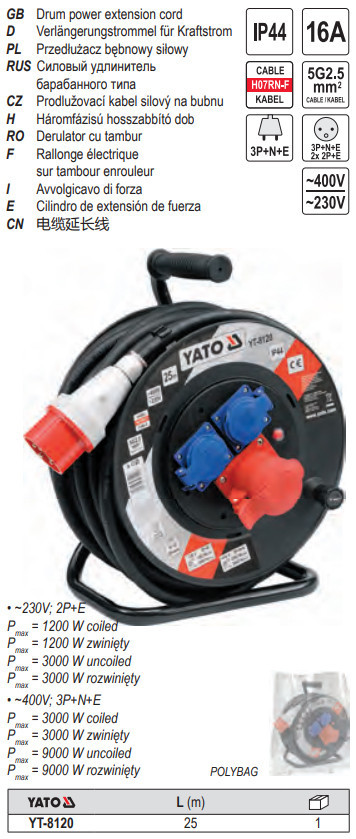 YATO építőipari és műhelyi erődob hosszabbító kábel, 25 méter hosszú , 2 db ~230V névleges feszültségű aljzattal gyermekvédelemmel és egy aljzattal ~400V névleges feszültséghez. A tápcsatlakozó egy 5 tűs csatlakozó, melynek névleges feszültsége ~400V. Hosszabbító kábel hővédelemmel. A strapabíró anyagból készült dobra tekercselt neoprén gumiköpeny kábel azt jelenti, hogy a hosszabbító kábel beltéren és kültéren egyaránt használható, például építkezéseken, kertben vagy gyártóüzemek előtti udvarokon.