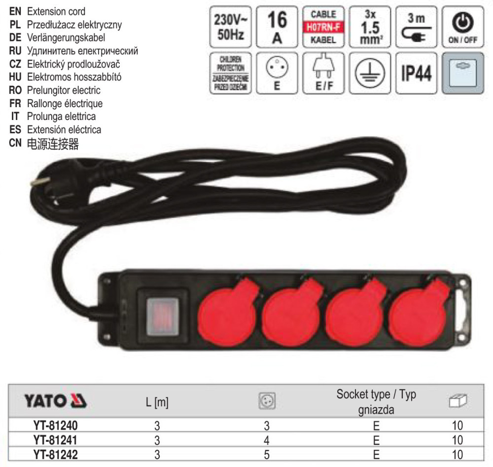 YATO YT-81240 Elektromos hosszabbító 3m 3 x 1,5 mm 3-as elosztó kapcsolóval