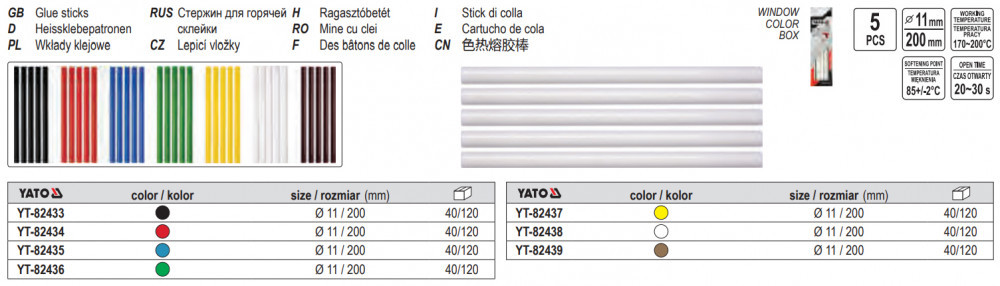 YATO ragasztóbetét 11mm átmérőben, és 200mm hosszban. 5db / csomag kiszerelésben, zöld színben. Kínálatunkban lévő mindkét ragasztópisztollyal használható. Lágyulási hőmérséklet 80-85 fok között. 170 és 200 fok között jól használható. 20-30 másodperc alatt megszilárdul. Háztartási ragasztásokhoz kiváló, kézműves alkotásoknak látványos dekorációja lehet.