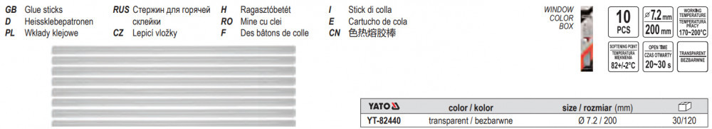 YATO ragasztóbetét 7,2mm átmérőben, és 200mm hosszban. 10db / csomag kiszerelésben, színtelen kivitelben. Lágyulási hőmérséklet 80-85 fok között. 170 és 200 fok között jól használható. 20-30 másodperc alatt megszilárdul. Háztartási ragasztásokhoz, kézműves alkotásokhoz kiváló.