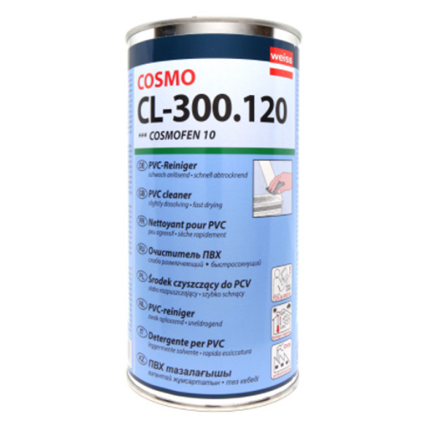 Cosmofen 10 közepesen erős PVC tisztító folyadék. Enyhén oldó hatású. Rászáradt ragasztószalagok, beivódott felületi szennyeződések, felületi karcolások eltávolítására alkalmas. Kifejezetten PVC ajtókhoz, ablakokhoz tervezve. Használat előtt a használati utasítás elolvasása és tudomásul vétele ajánlott, fokozottan tűzveszélyes folyadék. Használat közben védőkesztyű, szem és arcvédő használata kötelező.
